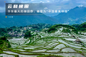 『云和梯田』云和梯田跨越高山、丘陵、谷地三个地质景观带,最多有700多层,是华东最大的梯田群,被誉为“中国最美梯田”。整个梯田景区面积巨大,分为白银谷和九曲云环两大游览区域。白银谷更受游客和摄影爱好者亲睐。