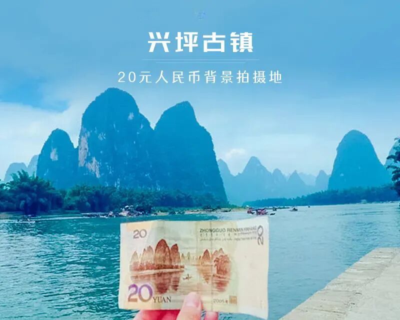 - 中午我们抵达20元人民币背景拍摄地。20元人民币背景图案拍摄地点,选取的是桂林漓江精华段兴坪古镇境内元宝山处,一个叫黄布倒影的景点,这里秀丽的山峦和清澈的漓江水相互交映,形成一幅绝美的画面,给人以一种山重水复之处突然柳暗花明的开阔感。而20元人民币的观景台,一路上有好几个,都是免费的,你可以找一个喜欢的角度拍,记得准备一张20元的纸币,拍起来更有感觉。