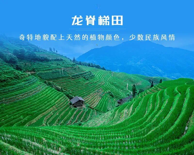 龙脊梯田位于广西龙胜各族自治县,梯田有鬼斧神工的造型和如诗如画的意境。曲线优美。其线条行云流水,潇洒柔畅;其规模磅礴壮观,气势恢弘,有“梯田世界之冠”的美誉。