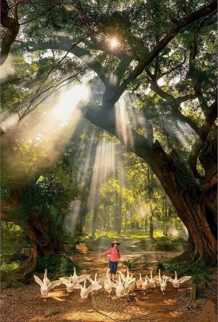 - 下午 前往杨家溪榕枫公园,古榕树虬枝伸展,遮天蔽日。古榕树下我们先安排老农牵牛拍摄:在古榕树下布置烟雾场景,阳光透过榕树间隙照射下来形成丁达尔光线,此时畲族阿婆挑担子,阿公牵牛配合拍摄;随后安排村姑赶鹅拍摄,这是杨家溪榕树下的新晋宠儿,村姑模样打扮的妇女赶着一群白鹅于榕树下觅食,憨态可掬的鹅群很是讨喜。