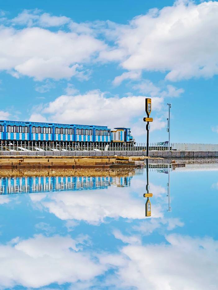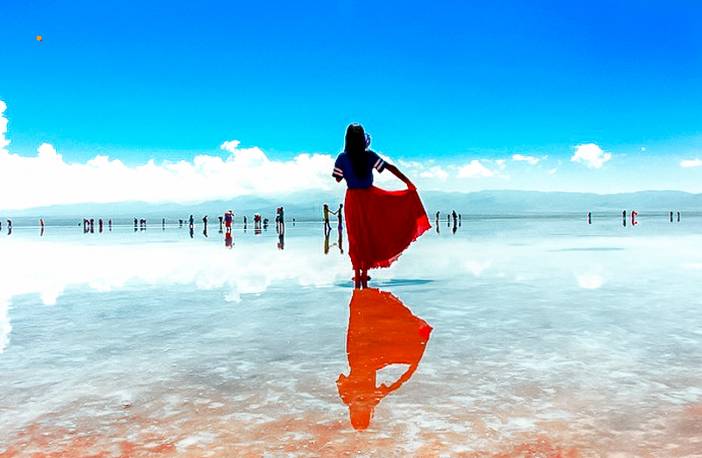 茶卡盐湖是柴达木盆地有名的天然结晶盐湖,中国的“天空之镜”,盐产量可供全国人民使用约75年。景区里有众多的盐雕可以观赏,还可以乘坐小火车,到盐湖的深处观光。大家可以赤脚走到湖面上观看和拍摄自己的倒影,如果足够幸运,白天可以看到在这些河面上形成的海市蜃楼。世界是个神奇的造物主,让世界上有着如痴的美景,这里是白色的世界盐的海洋,倒影,红裙……
