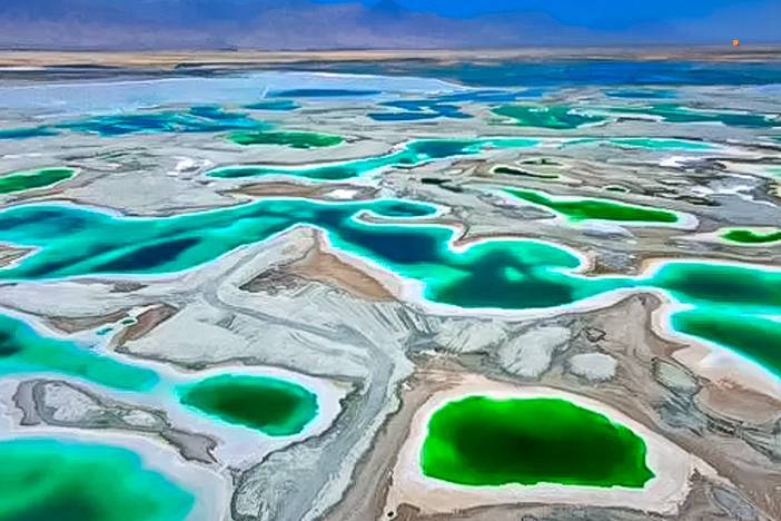 大柴旦翡翠湖属硫酸镁亚型盐湖,是海西州第三大人工湖,面积达26多平方公里,出产品质好的钾、镁、锂等多种元素,由于盐床由淡青、翠绿以及深蓝的湖水辉映交替、晶莹剔透,当地人称之为“翡翠湖”。