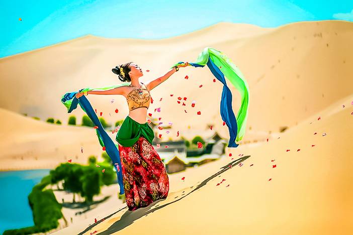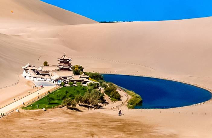 位于甘肃省敦煌市城南5公里的鸣沙山北麓,古往今来以“山泉共处,沙水共生”的奇妙景观著称于世。月牙泉被鸣沙山环抱,因水面酷似一弯新月而得名,这是鸣沙山景区最著名的地方。泉形酷似一弯新月,故名月牙泉。古称“沙井”,又名“药泉”。泉被鸣沙山四面环抱,但并不为流沙所掩,始终碧波荡漾,清澈见底,久雨不溢,久旱不涸。