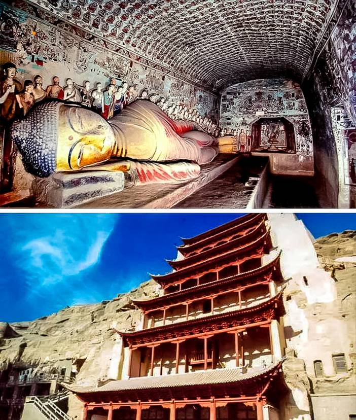 洞窟内到处画着佛像、飞天等,既有高达九层楼的坐像,也有十几厘米的小菩萨,数量众多,形态各异。现在莫高窟对面的三危山下,仿制了部分原大洞窟,使游客在莫高窟的观赏内容更加丰富多彩。