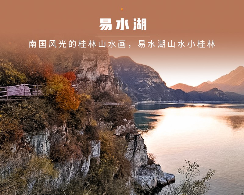易水湖现为国家4A级景区,总规划占地约108平方公里,水域面积27平方公里,依托绝佳的山水自然资源,已经建设有易水文化休闲度假小镇、养生岛康养小镇、老子峰3100米临水栈道、高端度假湖景酒店、水上运动等业态项目。