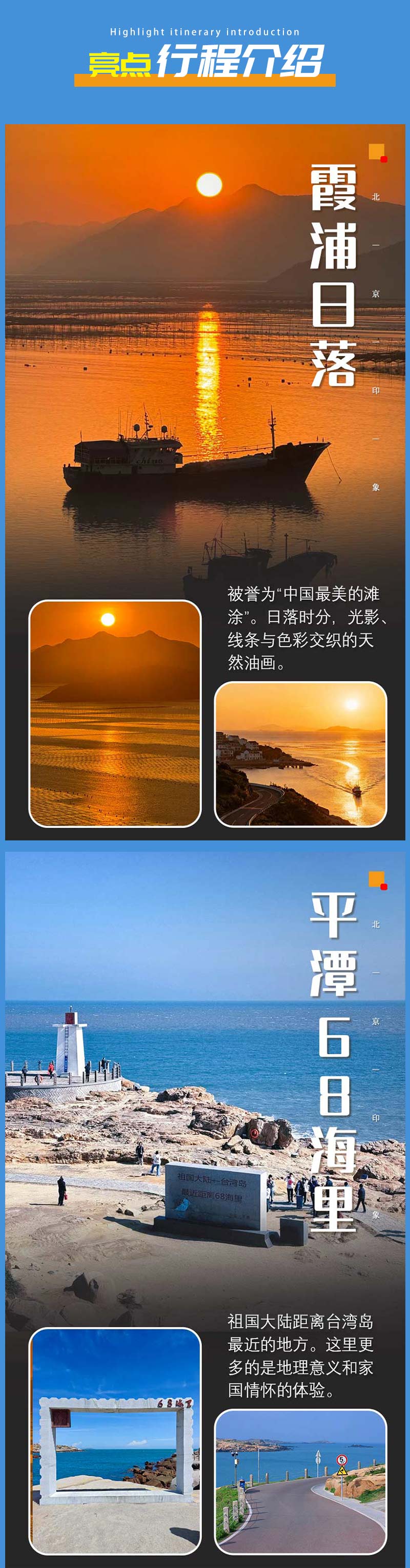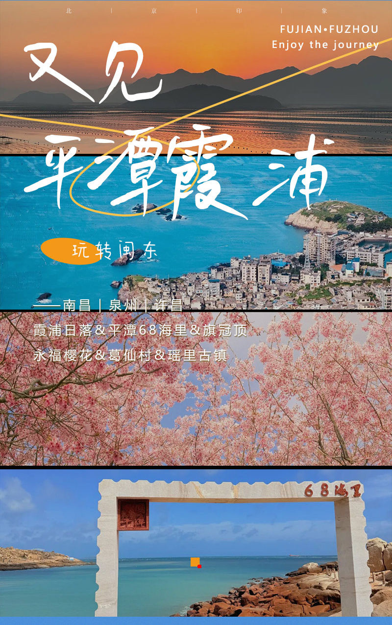 - 中午适时集合前往平潭猴研岛,游览【68海里景区】。这里是祖国大陆距离中国台湾岛最近的地方,我们在这里可以打卡网红小公路、花莲七星潭同款星星塔许愿,在距离台湾仅68海里邮戳相框合影。