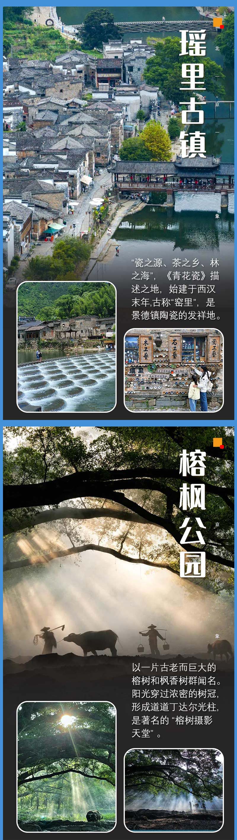 瑶里古镇素有“瓷之源、茶之乡、林之海“的美称,是国家重点风景名胜区、国家历史文化名镇、国家矿山公园、国家重点文物保护单位、国家自然与文化双遗产。瑶里古镇是典型的赣派建筑。瑶里有展示徽派“三雕”艺术的狮冈胜览、程氏宗祠;有展现封建家族礼仪思想的进士第;有再现革命斗争历史的陈毅旧居、抗日动员大会会场、红军游击队驻址;有印证往日繁华景象的明清商业街、徽州古道;有反映瑶里风土人情的灯彩、地戏,等等。