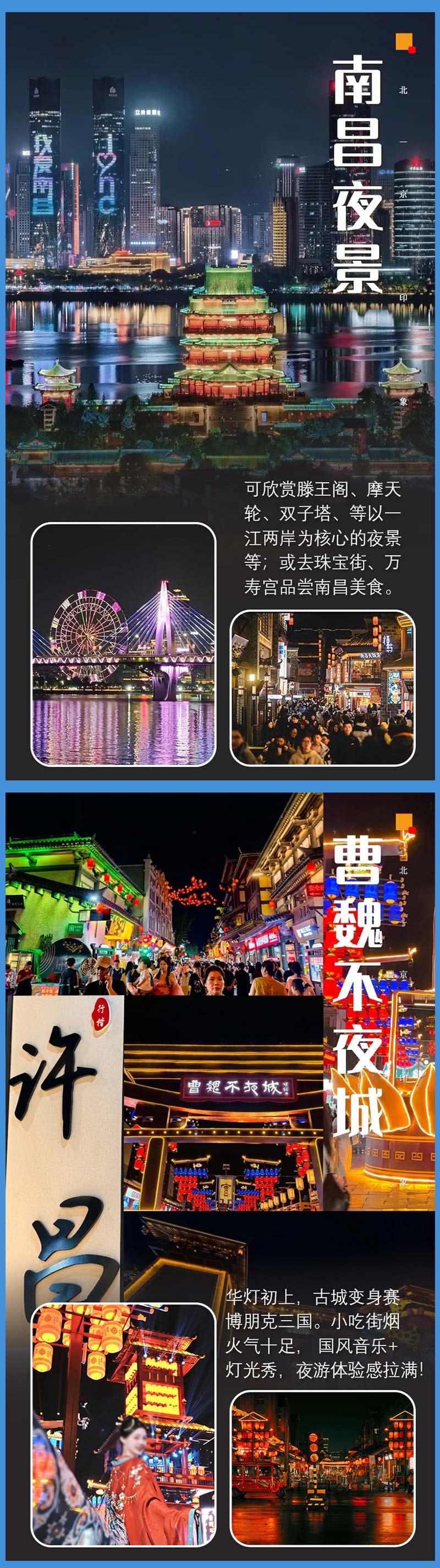 - 上午适时集合前往【南昌】,晚上到达南昌安排住宿。之后可自由结伴欣赏南昌醉美夜景,品尝当地美食,推荐地:滕王阁、秋水广场、八一广场、万寿宫、珠宝街、大士院、蛤蟆街等……