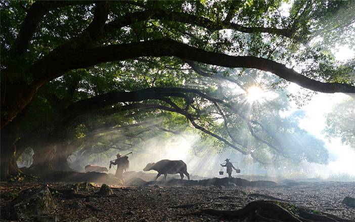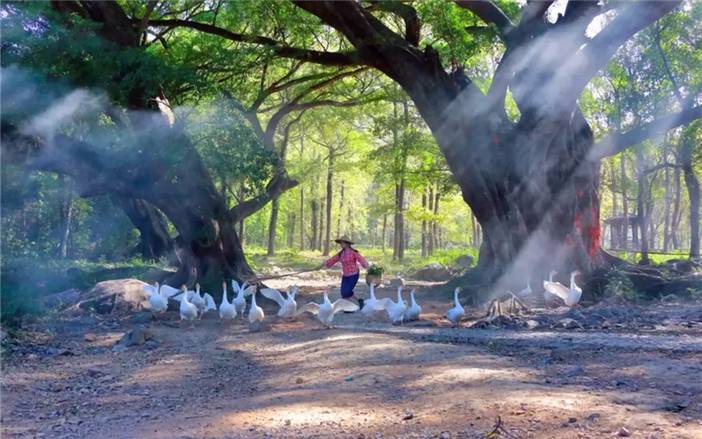 - 早上继续出发,下午抵达杨家溪【榕枫公园】游览。这里古榕树虬枝伸展,遮天蔽日。古榕树下我们先安排老农牵牛拍摄:在古榕树下布置烟雾场景,阳光透过榕树间隙照射下来形成丁达尔光线,此时畲族阿婆挑担子,阿公牵牛配合拍摄;随后安排村姑赶鹅拍摄,这是杨家溪榕树下的新晋宠儿,村姑模样打扮的妇女赶着一群白鹅于榕树下觅食,憨态可掬的鹅群很是讨喜。
