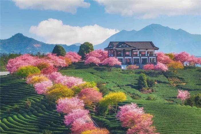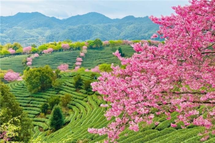 - 今天要早起,我们集合前往龙岩永福【台品樱花茶园】游览。这里是福建的樱花园经典打卡地,我们漫步在4.5公里长的茶道小径上,可观赏两旁万余株樱花迎春绽放,大家可以在这里留下自己浪漫的樱花想象!永福樱花园永福台品樱花茶园以樱花品种多、花期长、规模大被誉“大陆阿里山”,以其独特的茶樱共生梯田景观被国家地理杂志评选为“中国樱花圣地”!沿茶道两旁依次而种的万余株樱花迎春绽放,火红的樱花蜿蜒点缀在碧波翻滚的茶山上,有如五线谱绚烂跳跃,弹奏着绿茶和红樱相伴相守的浪漫乐章。