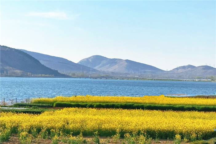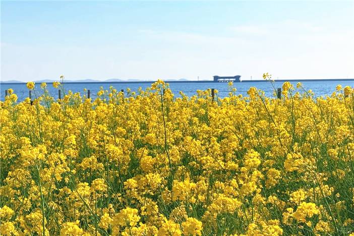 - 早上|我们到达【庄里油菜花海】游览。庄里水库岸边绵延数公里成片的油菜花田里,花开烂漫、耀眼夺目。片片块状的油菜花海金灿灿,与农作物田块交织,共同映照着清透的湖水和远处的青山,呈现出一幅生机勃勃而又诗意盎然的田园画卷。