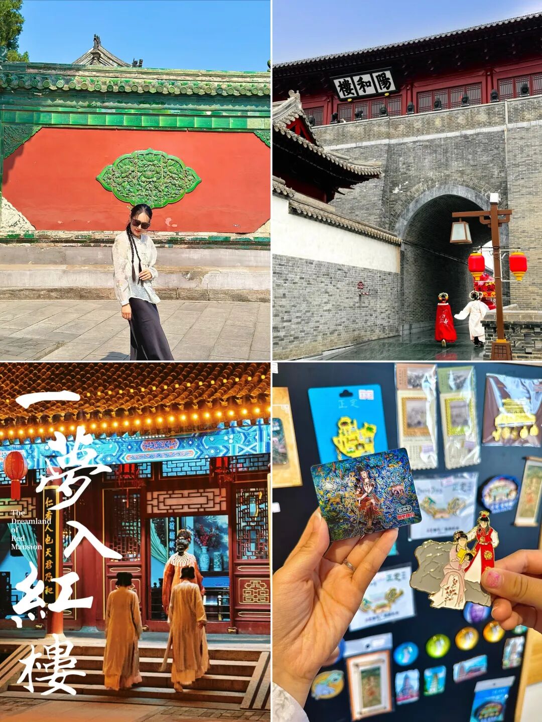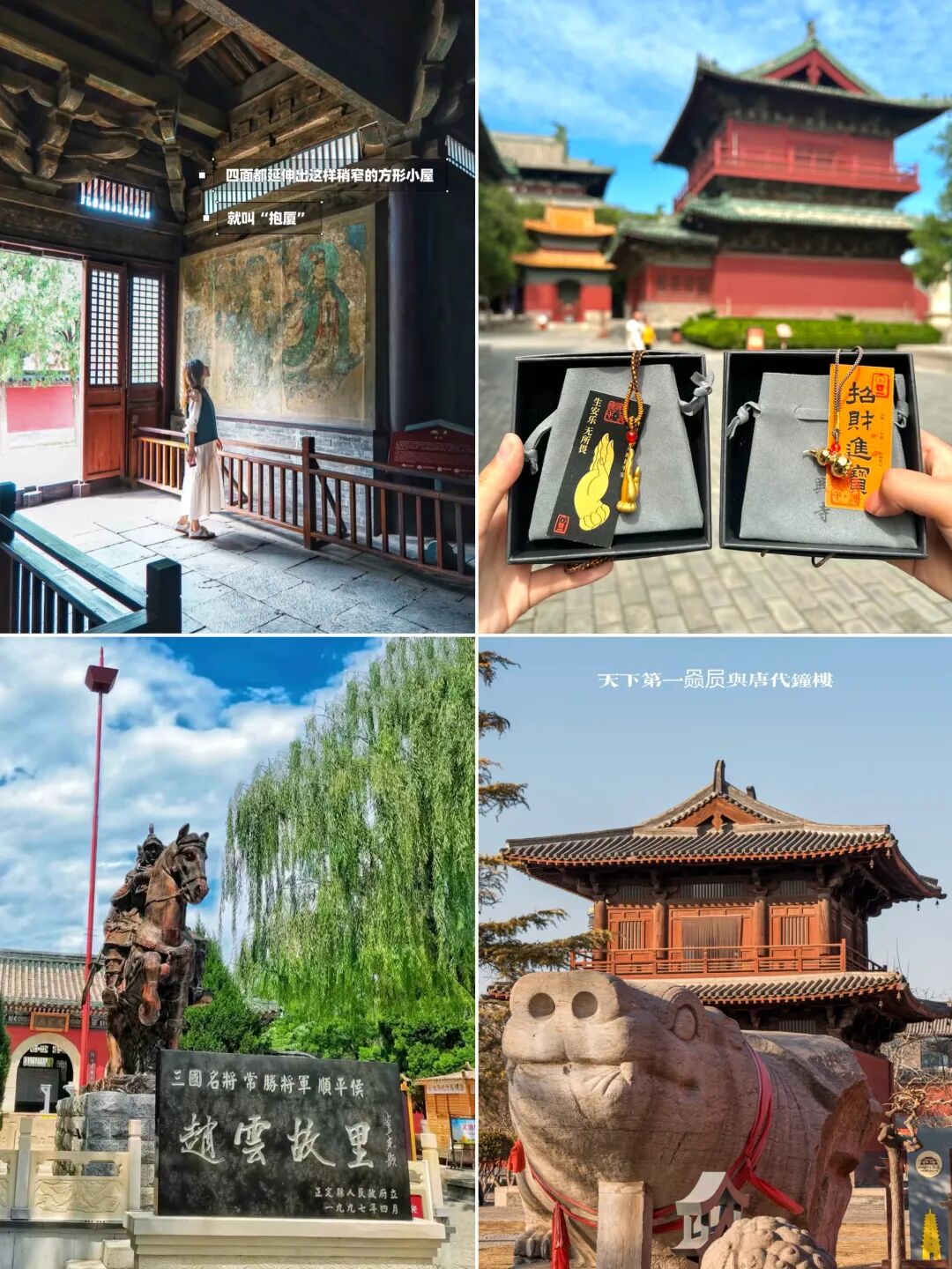 - 第一次来到正定古城,先跟领队一起打卡86版红楼梦的拍摄地【荣国府】曹雪芹纪念馆是荣国府不可错过的一站,这里详细展示了曹氏家族的盛衰历史以及《红楼梦》的创作背景。荣国府有三场“-梦入红楼”演出活动;再打卡最有名的【降兴寺】初次来这里真真的会被寺里的佛像震撼到了,这里的 东方美神,千手观音千年壁画,绝对值得,相见恨晚!后悔没有早点到来;继续游览天宁寺【凌霄塔】砖木混合结构,宋金建筑下三层为砖塔,第四层铺作开始为木质,上三层是木塔,内有塔心柱;接着游览开元寺九层密檐式方塔【须弥塔】与西安大雁塔形式相似,原塔很朴素,毫无装饰,后来清代增加了塔底层四角各两个力士雕像,以及券门楣及两侧浮雕,这里还有我国唯一座唐代时期的钟楼,世界上第一大的【赑屓(bi xi)碑座】;继续游览临济寺【澄灵塔】梁思成曾赞誉“清晰秀丽,塔中之上品”,塔中安有义玄禅师的舍利;广惠寺【华塔】中央主塔由四座六边形单层小塔簇拥,看上去像是一捧花。主塔四层的椎体上雕满塑像,宛如印度教神庙。梁思成认为是金刚宝座塔的一种变体,乃海内外孤例;【阳和楼】始建于金朝近年重建,登楼可以俯瞰古城中轴线;【南城门】登上城墙能看到四塔同框,城门里面还有完整瓮城;正定是赵云的老家【赵云庙】面积不大很清幽,主要有山门殿,君臣殿,五虎殿,顺平侯店和兵器库几部分组,承载着三国时期英勇将领赵云的传奇故事。一走进赵云庙,仿佛回到了那个英雄辈出的年代,有三国情怀的不可错过;