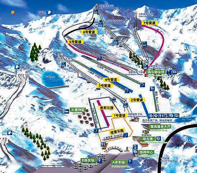 雪场雪道由1条高级道4条中级道和4条初级道、一座滑雪公园、一座戏雪乐园组成。雪道最大落差可达238米是北京地区雪道最长,规模最大的国际级滑雪场。雪场拥有三条滑雪缆车及一条拖牵道、四条魔毯;日接待能力7000人,千余个停车位。