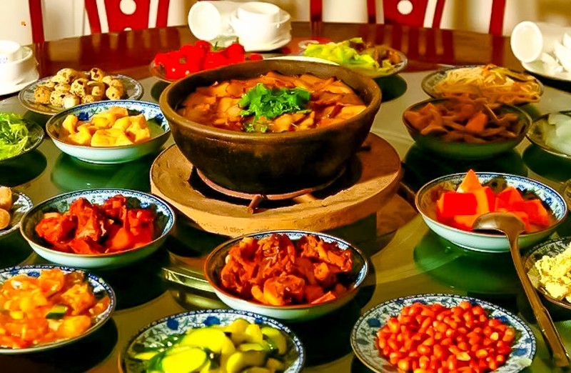 四周配以具有农家特色的三个辅锅,三个小碗,六个凉菜,取三羊开泰、四平八稳、六六大顺之意以传统制作工序和制作工艺进行加工制作—以豆腐为主,以其他菜肴为辅—着重于美容、养颜、滋补。