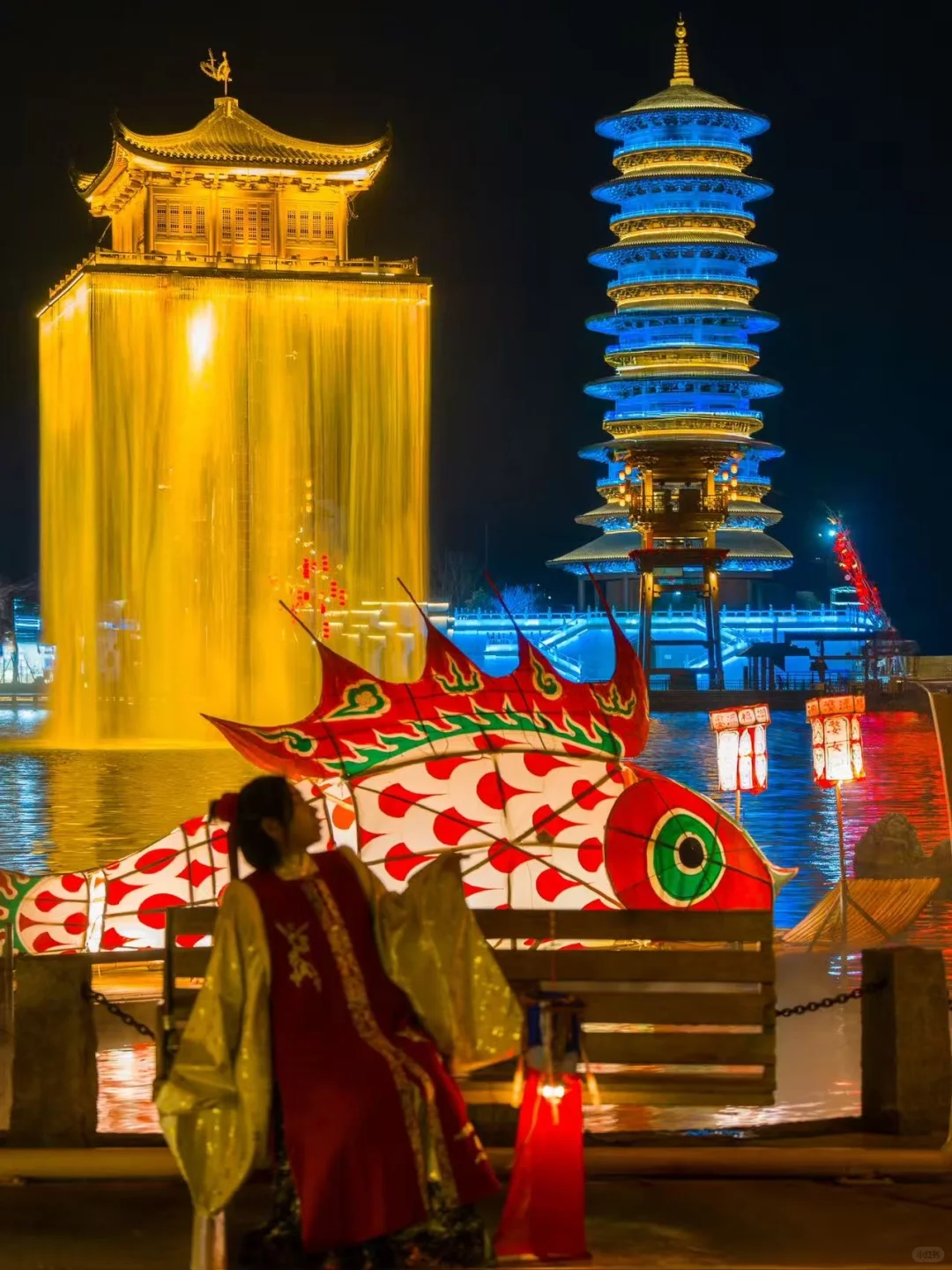 婺女洲婺女洲度假区以婺女飞天传说故事为核心,充分挖掘徽州文化的美学内涵,运用理学、徽商、非遗等多元文化致力于构建中国新式徽艺度假生活。现实版“盛世徽州夜”总要去一次婺女洲吧!!去感受一次“东风夜放花千树,更吹落,星如雨”的热闹过年氛围,踏入景区大门,映入眼帘的便是繁华的灯会和古街,各式各样造型的灯笼令人目不暇接…….原来古诗词里描述的场景真实存在,夜晚小镇被灯光点亮,湖中金阁仿佛天上宫阙。