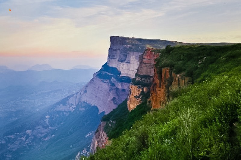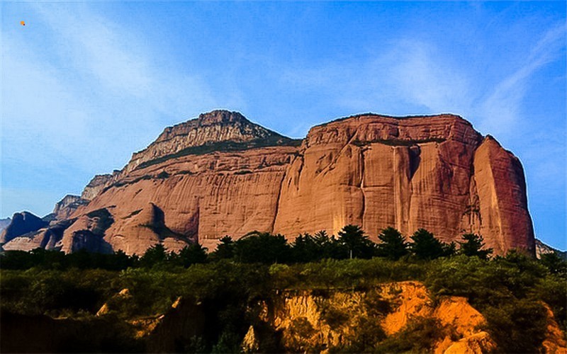 后城赤壁顶端平坦,两侧一边为断裂山谷,一边为峭壁悬崖;它的宽度仅几百米,而长度却达20公里左右,从后城镇北边,自西南向东北方向延伸至龙门所为止,当地人称它“四十里长嵯”。这里地势本来就高,海拔一千多米。在一千多米的“地基”上,有着高度三百多米的山坡作为“底座”,当地人称为“土台”。这“土台”如同一个厚重的盘子,上面托举着世界第三、亚洲第一的巨大单体岩石。