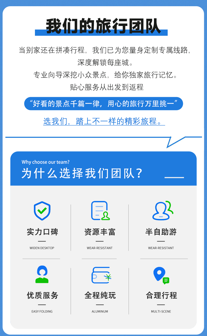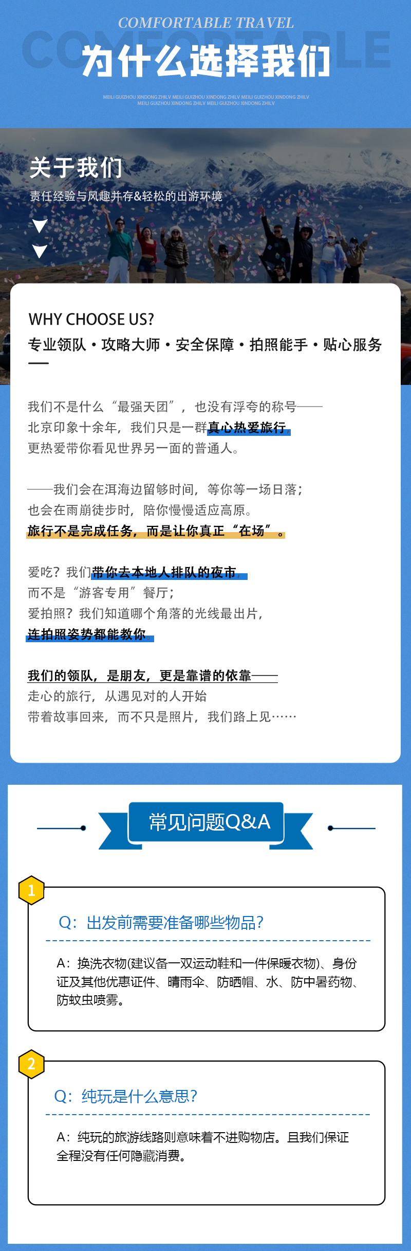 3、成团说明:如因参团人数未达到发团人数则取消当期活动,活动出行前提前通知并全额退款,积极为游客推荐类似路线或拼团。