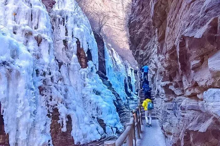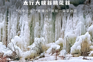 早餐后乘车前往【太行大峡谷】迷人的景点——【桃花谷】,桃花谷俗称“谷中之谷”,又称“爱情谷”,谷内奇峰突兀,峭拔雄壮,传说因三九严寒桃花开而闻名于世。此行数九寒天,虽不见桃花盛开,却有着冰瀑倒垂,冰挂林立,晶莹剔透,婀娜多姿,犹如一朵朵冰花,美不胜收。