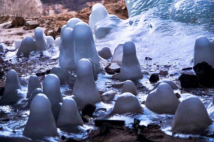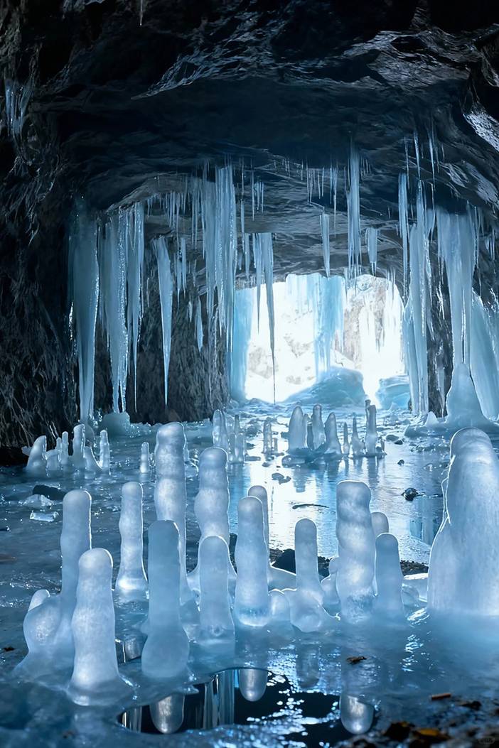 冰蘑菇洞位于河南省林州市合涧镇八达村附近,且有几处山洞,洞的形状呈口袋状,洞顶上滴下来的水,很快能结冰,逐步形成一整片的落地冰柱,或相拥一团,或独树一帜,高的大约60厘米左右,低的大约在5厘米左右,由于高矮不一,密布较大,如同茂密的蘑菇群,生长在山洞中。进入洞内,你会发现,目光所及之处,都是透明状的“蘑菇”,或相拥一团,或独树一帜,高的大约60厘米左右,低的大约在5厘米左右!