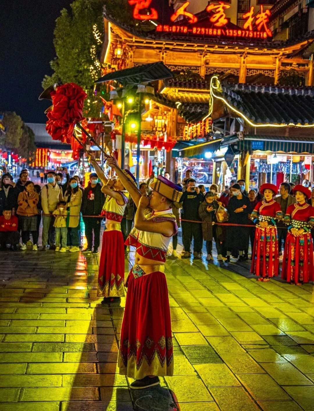 - 适时集合前往【女儿城】附近安排住宿。晚上大家自由游览“世间男子不二心,天下第一女儿城”的土家女儿城,更有大型室外情景区《赶场相亲会》表演可以观看。小吃街、民俗博物馆、酒吧街、中国首创室内情景剧场女儿城大剧院,都能让你了解到多情旖旎的土家族风情,感受这个少数民族的生活文化。还可以亲身体验土家族的摔碗酒、摆手舞等土家风俗。这是一个在一座城里看尽恩施民俗风情的地方,能够恩施本土阿哥幺妹同聚一地。