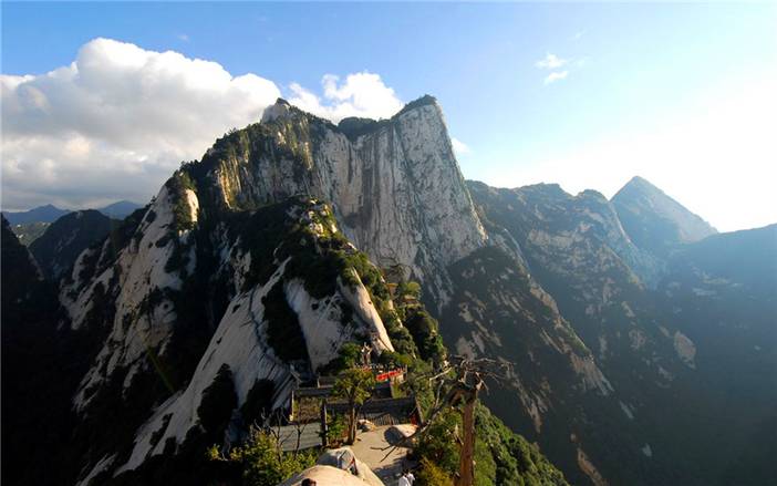 华山海拔2154 .9米,古称“西岳”,是我国著名的五岳之一,也是秦岭的一部分。它南接秦岭,北瞰黄渭,扼守着大西北进出中原的门户。华山是由一块完整硕大的花岗岩体构成的,华山有东、西、南、北、中五峰,主峰有南峰“落雁”、东峰“朝阳”、西峰“莲花”,三峰鼎峙,“势飞白云外,影倒黄河里”,人称“天外三峰”。