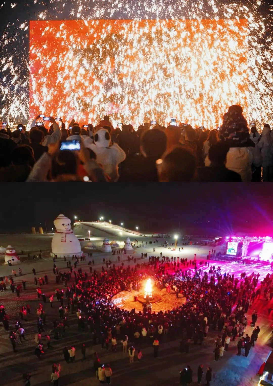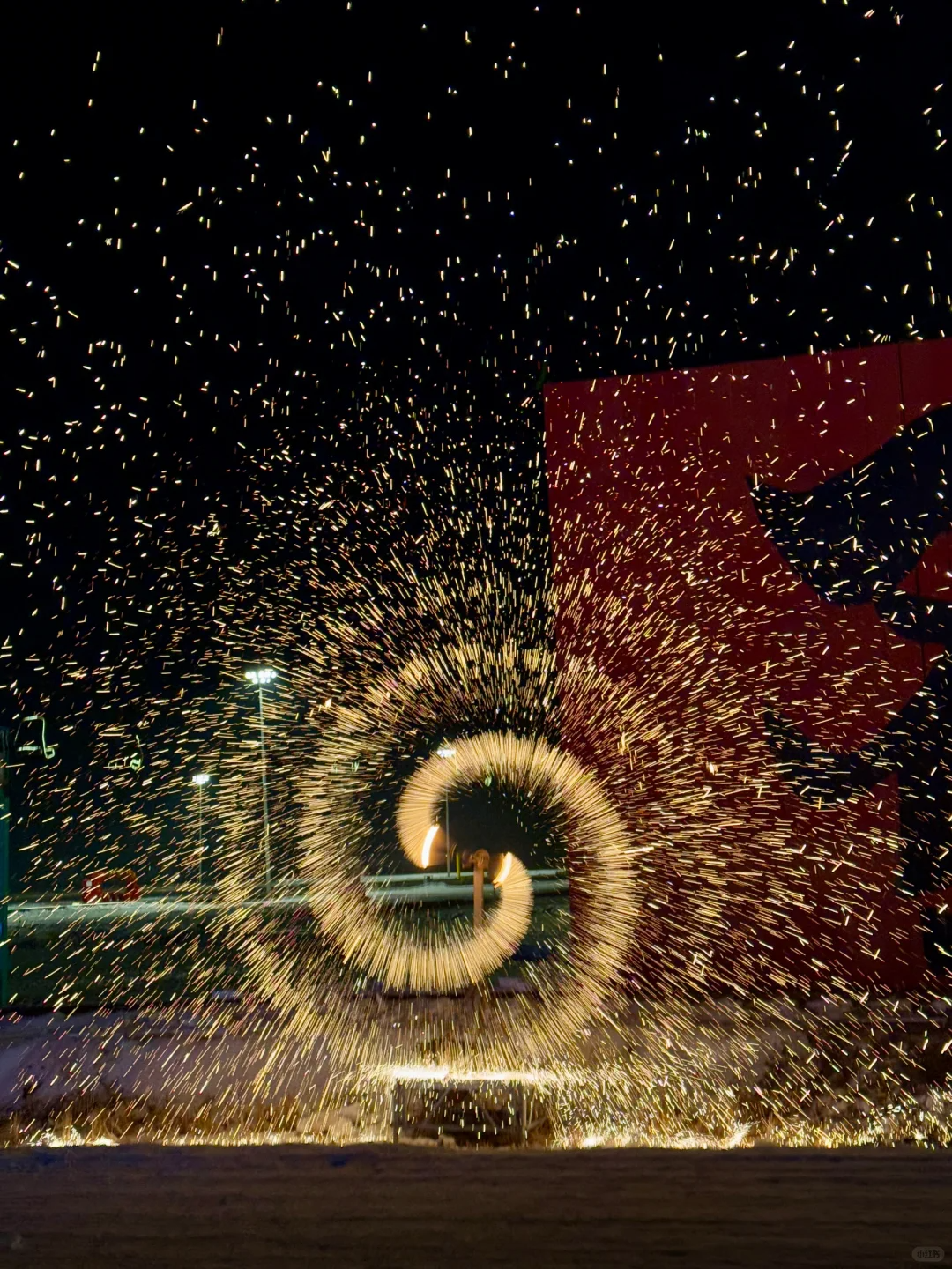 夜嗨模式 当夜幕降临,雪地蹦迪、篝火晚会、打铁花表演等精彩活动轮番上演。动感的音乐与冰雪的寒冷相互碰撞,熊熊燃烧的篝火驱散了寒冷,绚丽多彩的打铁花如流星般划过天际,构成如梦如幻的绝美画卷。