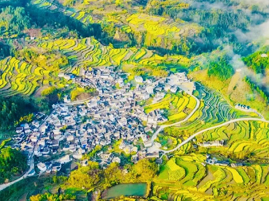 层层叠叠的梯田油菜花与白墙黑瓦的