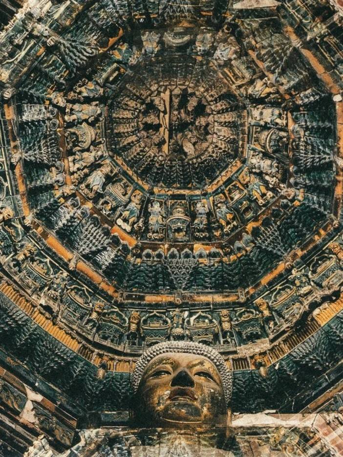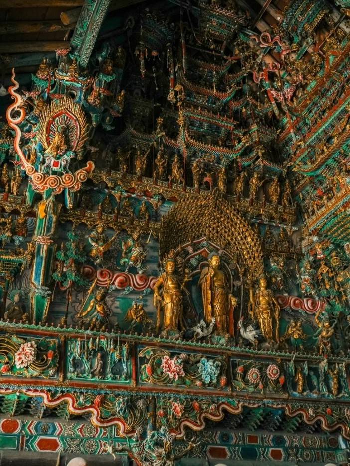 这是一座佛教禅宗寺院,是中国雕塑艺术史上的“悬塑绝唱”,是一场震撼人心灵的美学盛宴,1000 多尊彩塑如层峦叠嶂一般耸立着。169.6平方米的大雄宝殿里,这是从云端落下的富丽堂皇的极乐世界,乐伎轻歌曼舞,飞天安详飘动。