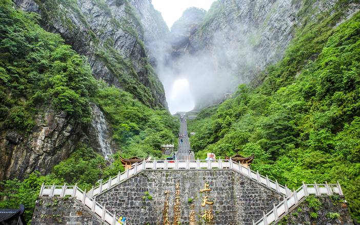 - 早餐后从酒店集合出发,前往【天门山国家森林公园】游览,约中午抵达。天门山:文化底蕴深厚,有“武陵之魂”之称,更有湘西第一神山的美誉,它兼峰、石、泉、溪、云、林于一体,集雄、奇、秀、险、幽于一身,被誉为空中原始花园。我们乘坐天门山索道,前往游览天门山:观天门洞、99道弯公路奇观(通天大道)、李娜别墅、鬼谷栈道、鬼谷兵盘、云梦仙顶、天门山寺、灵泉院、木石之恋等著名景点。天门索道:索道线路斜长7455米,上、下站水平高差1279米,是世界最长的单线循环脱挂抱索器车厢式索道,犹如一道彩虹飞渡“人间” “天上”,又象一条巨龙腾翔素云苍穹,依山籍壁,拔地冲天,荡气回肠,恢宏壮观,成为天门山旅游风景区“四大奇观”之一。