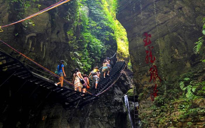 - 早餐后继续游览白天的凤凰古城,10点集合统一集合我们前往芙蓉镇的【坐龙峡】景区游览。(坐龙峡暂时在维修,如春节不开放,则凤凰古城多玩会,之后直接去芙蓉镇)。坐龙峡是由风蚀、水蚀长期作用形成的喀斯特地貌景观群,瀑布与深潭遍布其间,空气清新,夏季阴湿凉爽,有湘西“天然空调”的美誉。不过最大的特色,还要数石壁之间那恐怖的栈道了——无论木头搭成的窄道还是绝壁侧面的台阶,都是悬空的,附近的古村寨依山而建,保持着原始的土家文化。