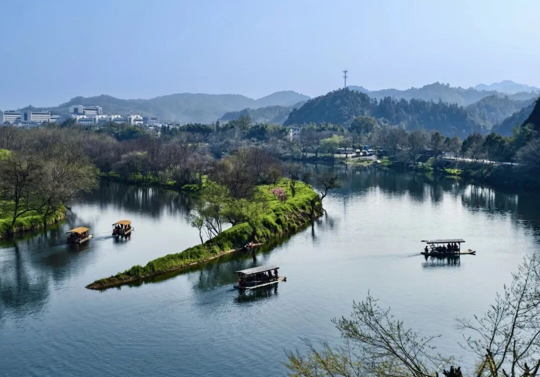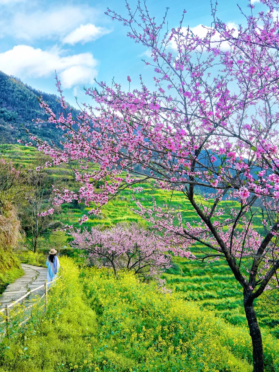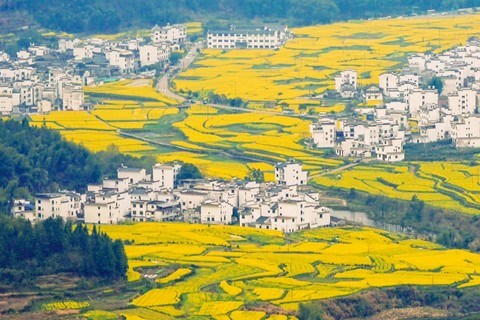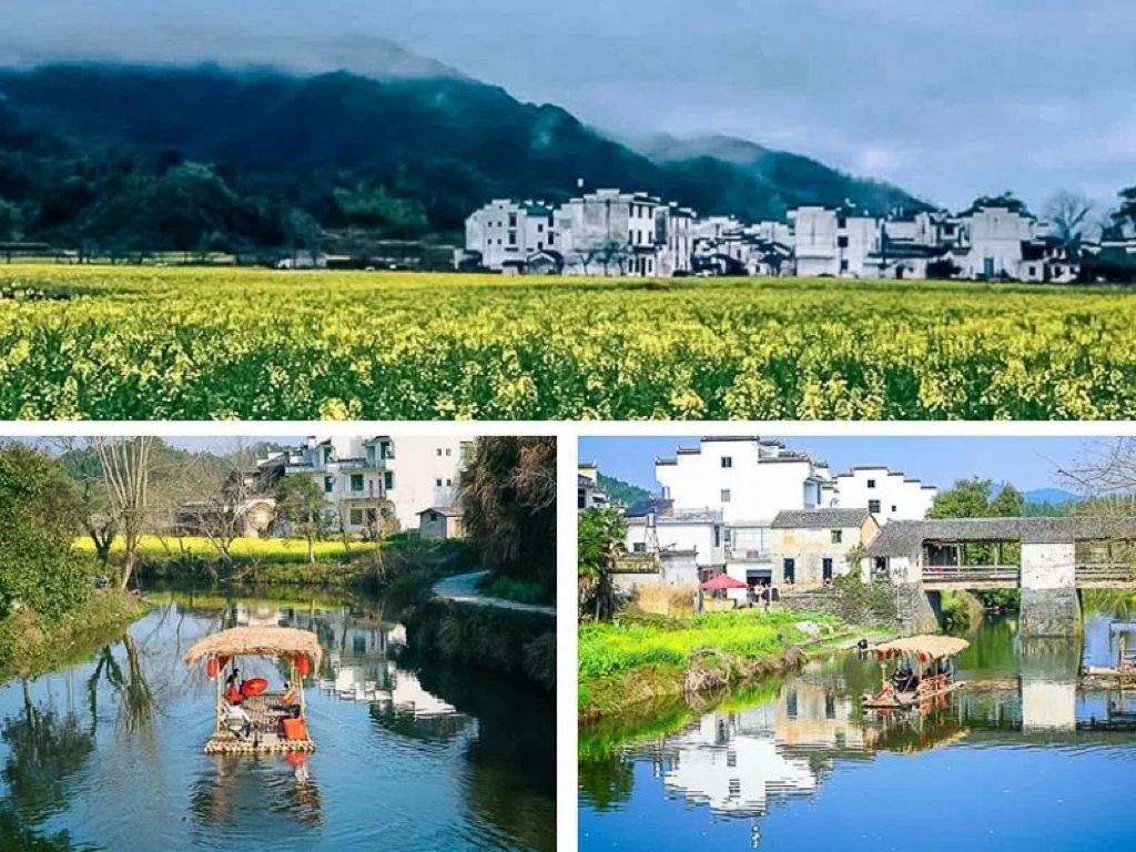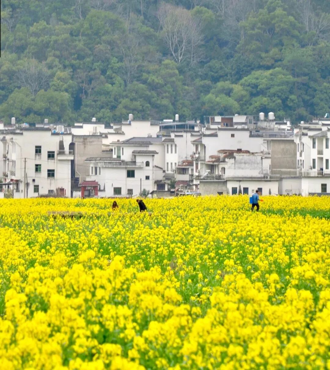 三月中下旬,棵棵粉红的桃花、洁白的梨花点缀在漫山遍野金黄色的油菜花中,掩映着白墙灰瓦的徽派建筑,使得每一个逃离纷繁城市的人都能找到归宿。