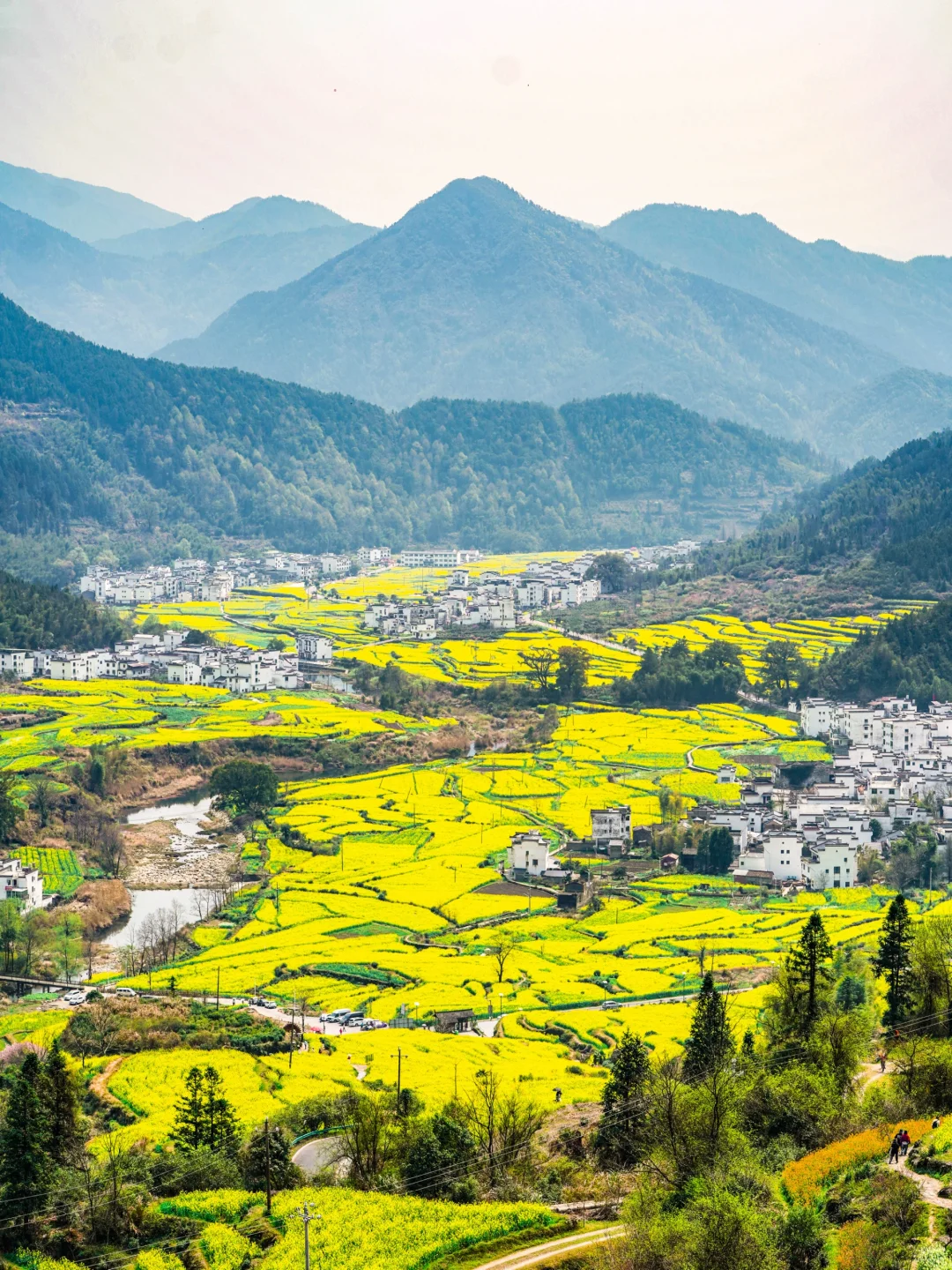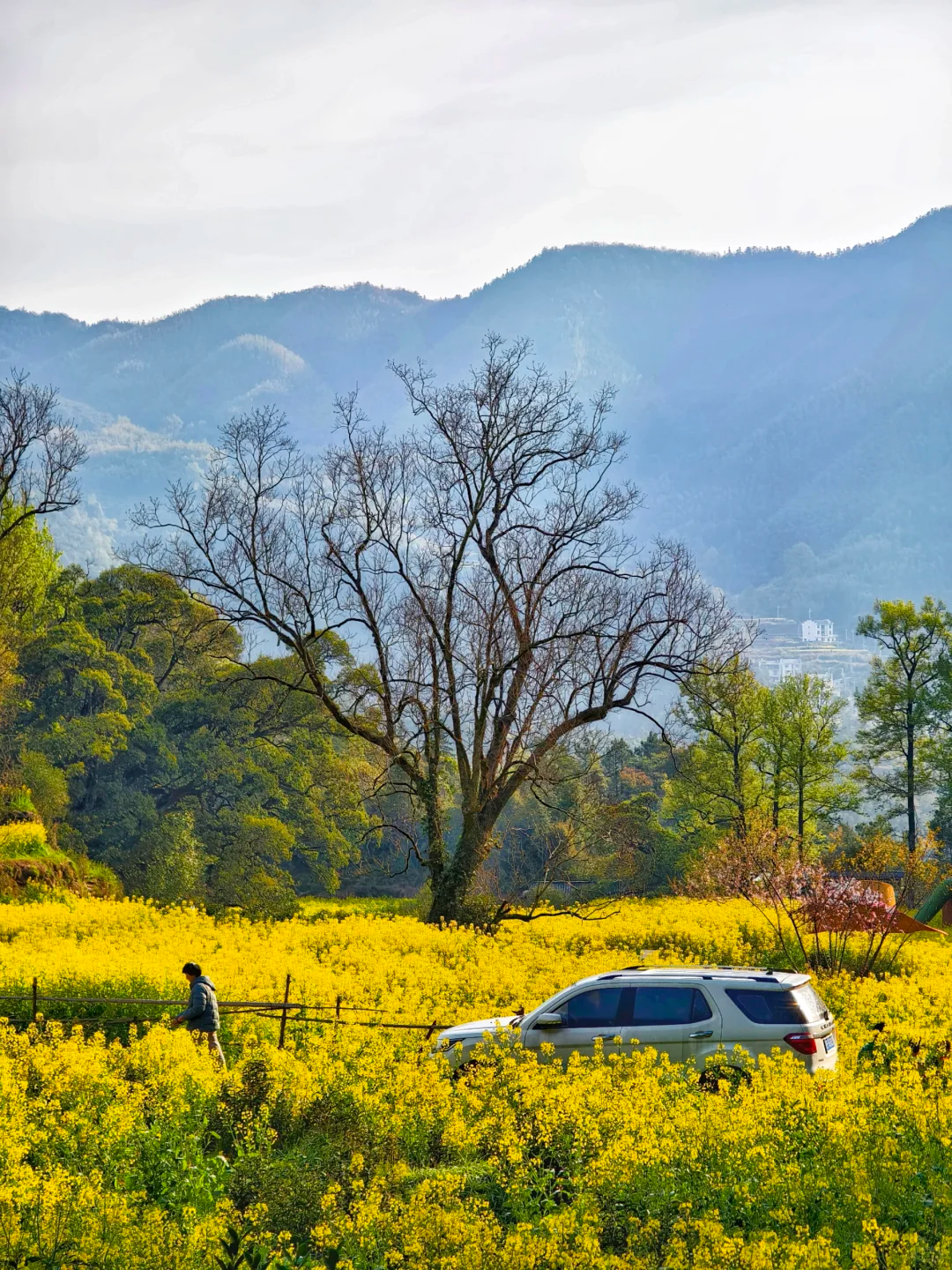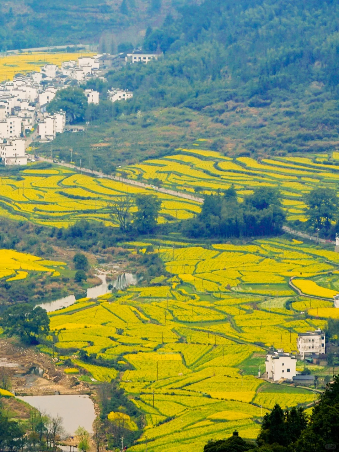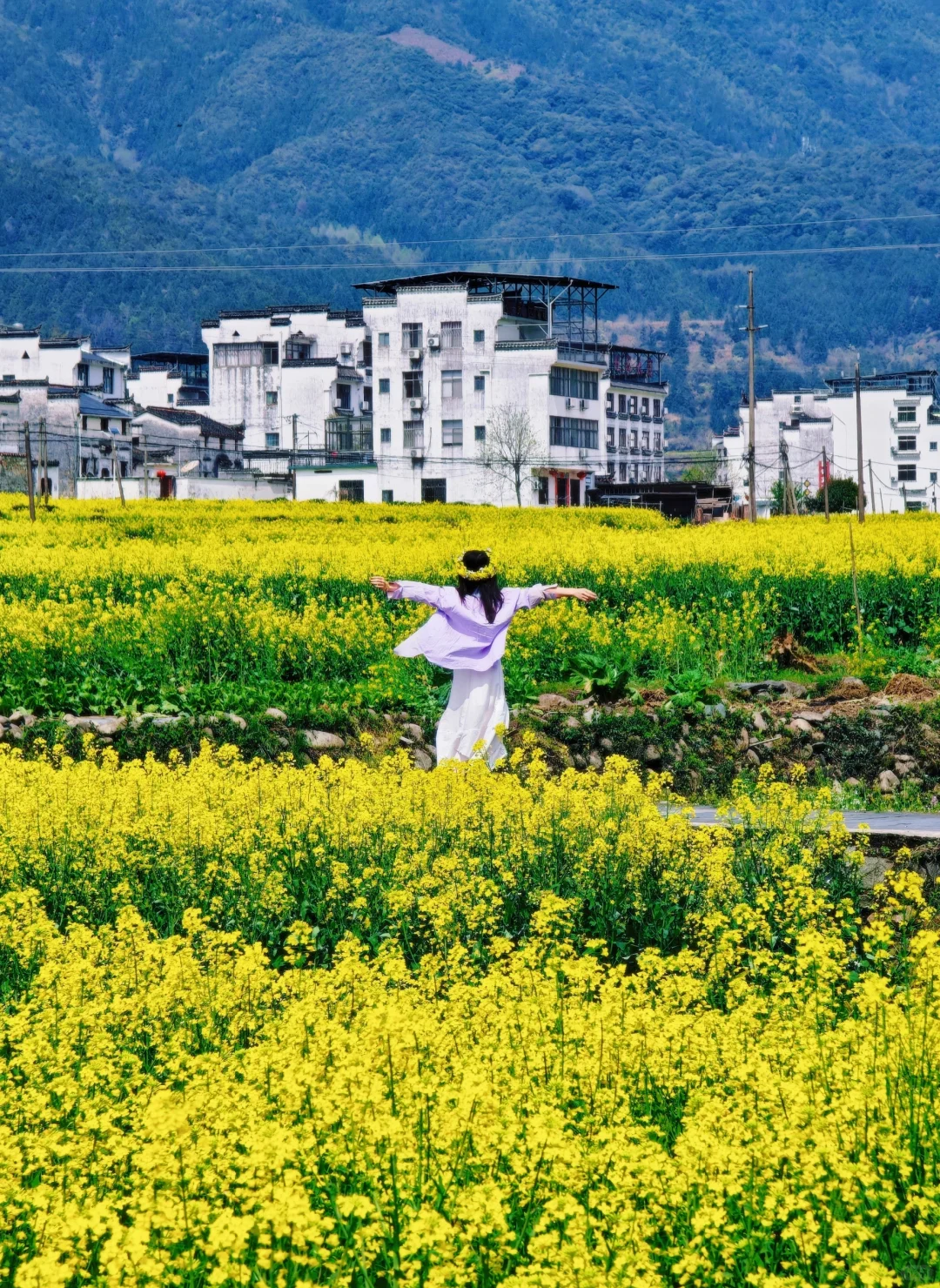 黄灿灿的油菜花与远山、近水、粉墙、黛瓦相映成趣
