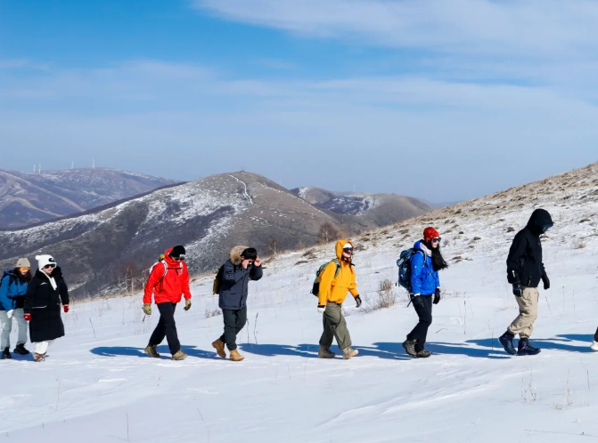 我们将向着这片 “雪域秘境” 进发。徒步途中,成片的桦树林褪去叶片,洁白的枝干在寒风中挺立,像是守护雪山的卫士;脚下的雪地松软而纯净,延伸向远方与蓝天相接,偶尔能看到野兔、松鼠的足迹,为这片寂静的雪原增添了几分生机。 值得一提的是,桦皮岭的 “风车群” 也是冬日里的独特景观 —— 数十座白色的风力发电机矗立在雪山之巅,叶片在寒风中缓缓转动,与纯白的林海、湛蓝的天空构成一幅极具冲击力的画面。