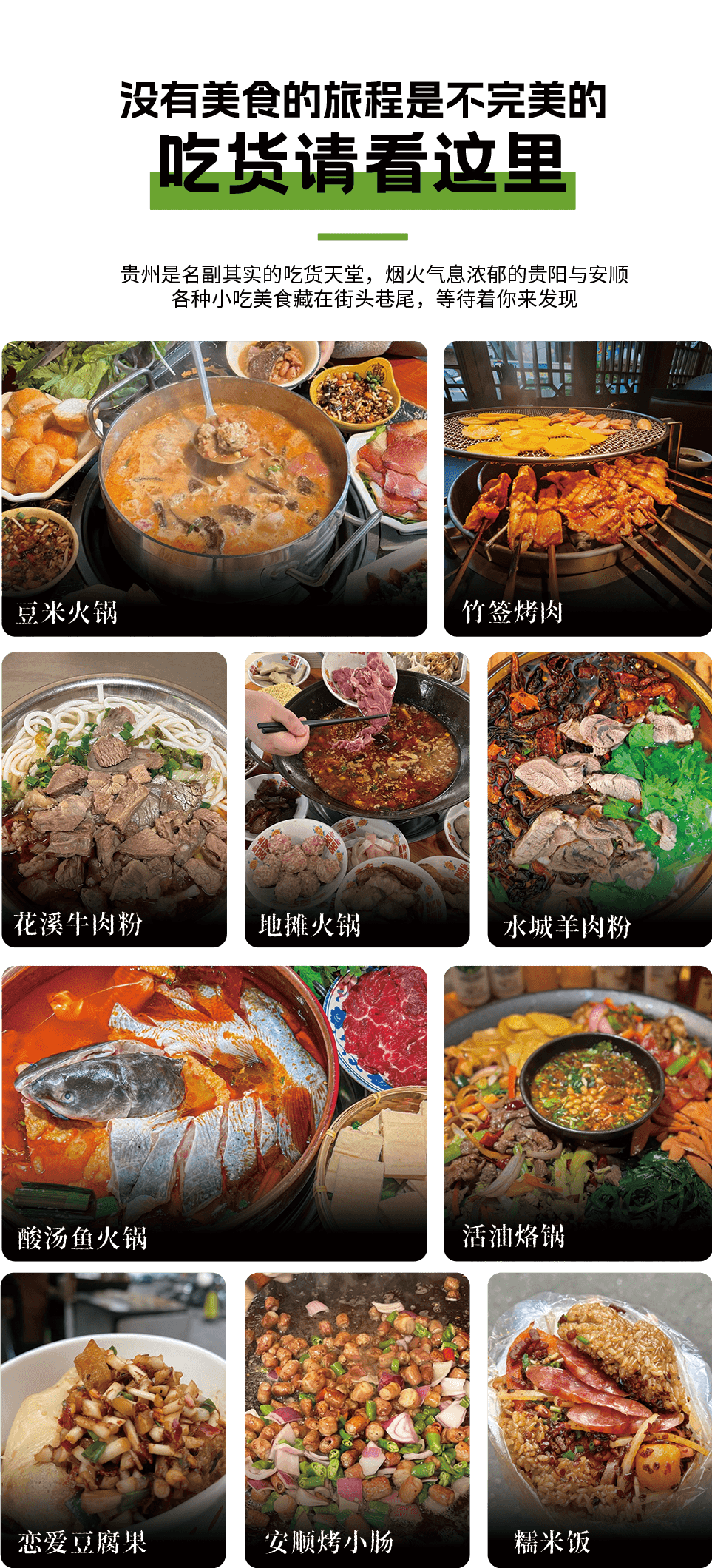 ② 美食推荐:青岩猪脚、豆腐丸子、糕粑稀饭、独山虾酸、荔波豆花烤鱼、佳荣生态牛肉火锅;